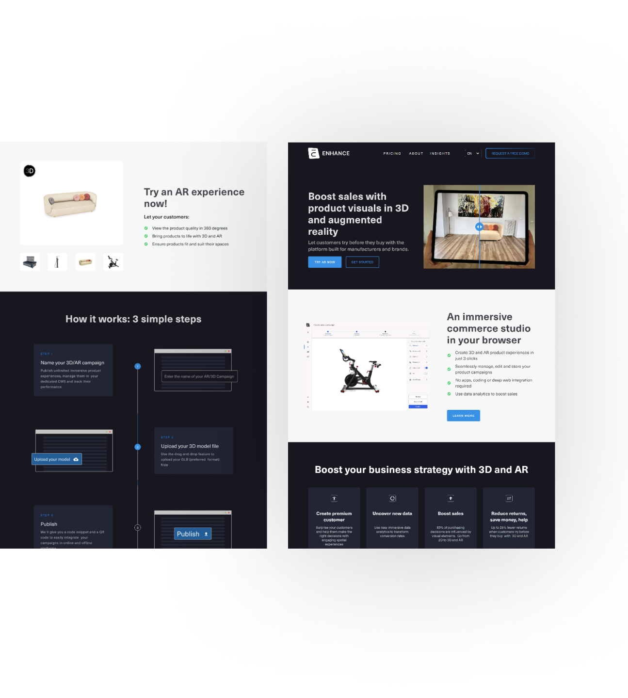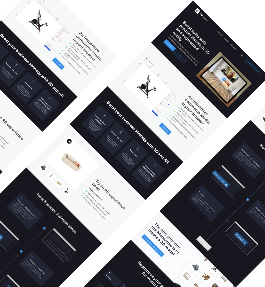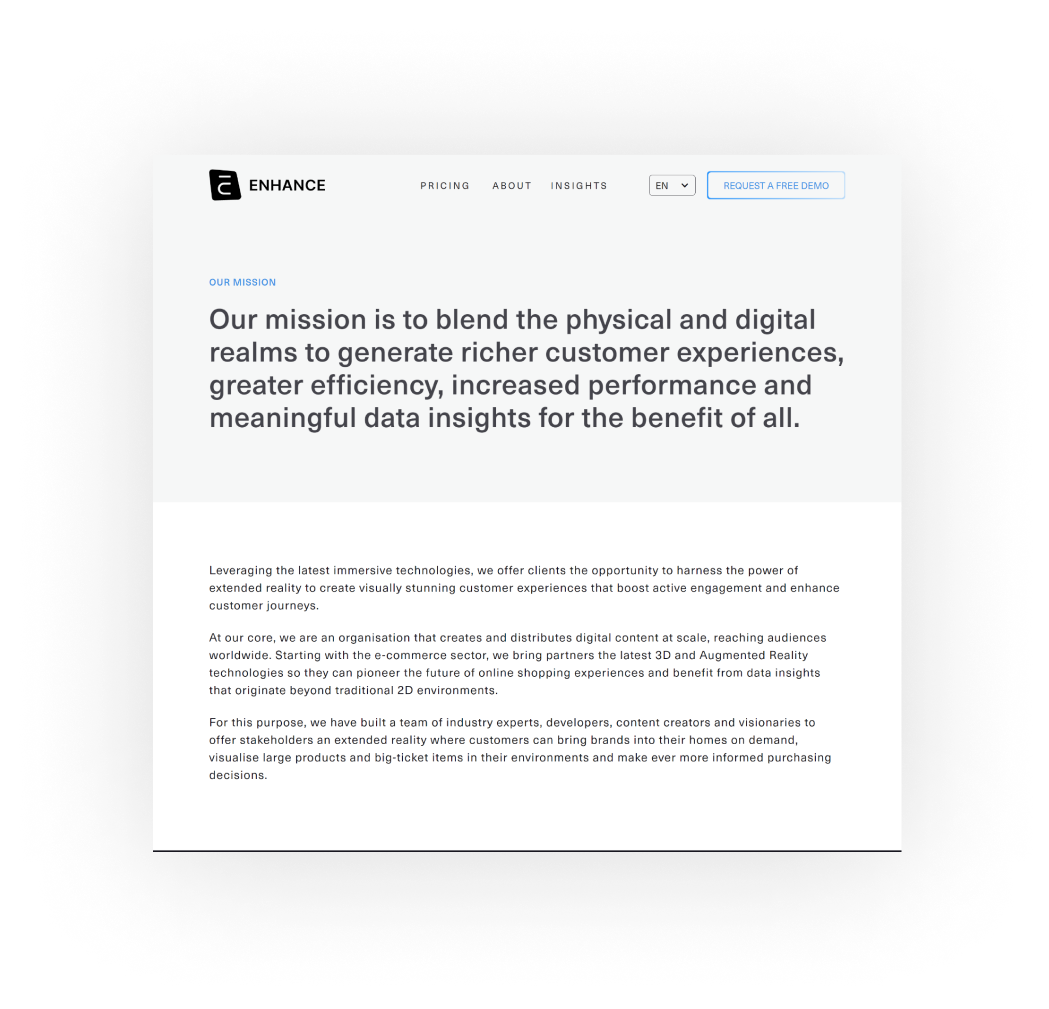 Leveraging the latest immersive technologies, Enhance offer clients the opportunity to harness the power of extended reality to create visually stunning customer experiences that boost active engagement and enhance customer journeys. Enhance has built a team of industry experts, developers, content creators, and visionaries to offer stakeholders an extended reality where customers can bring brands into their homes on demand, visualize large products and big-ticket items in their environments and make ever more informed purchasing decisions.