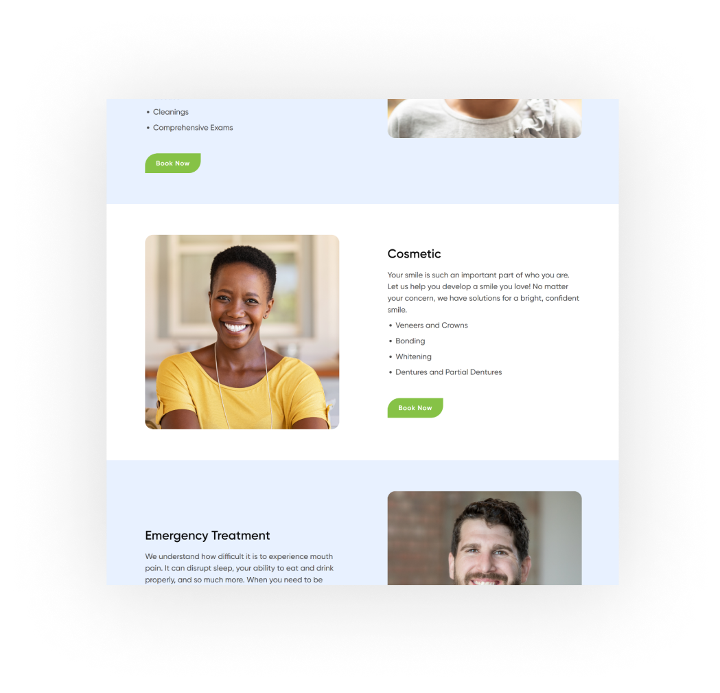 Designing a dental website was much more than I expected, everything from font to color and images plays a huge role in affecting potential client choice. Comprehensive market research was carried out and approved designs were tested. we found out soft and comforting colors like light-blue, rounded corners, and creatively making the buttons look like the shape of a tooth all influenced user's decisions. more clicks and calls have been recorded and gentle dental has had a surge in requests after implementing my new design.